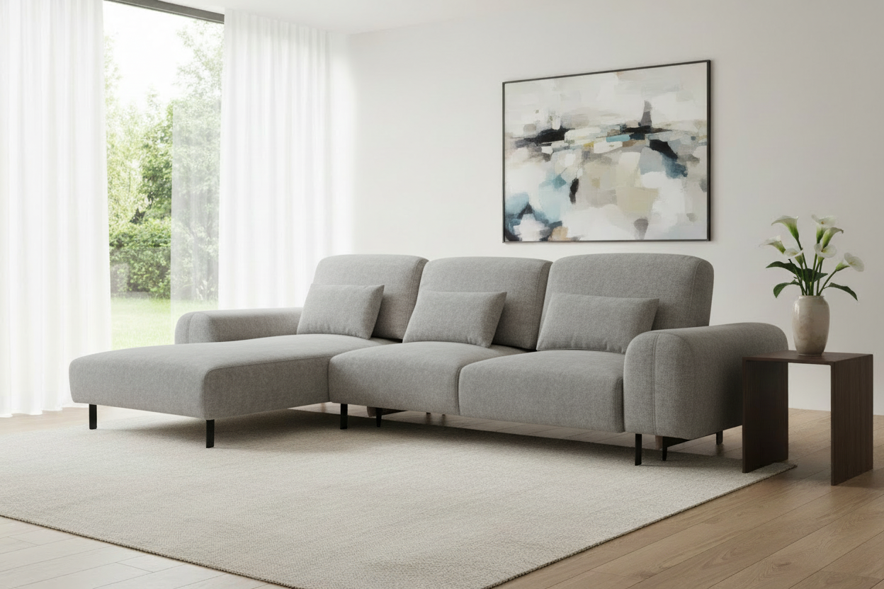 The Milan corner sofa is an elegant and modern piece of furniture, handcrafted with attention to every detail. Filled with carefully selected high-resilience foams, supported by wooden spring slats, it ensures exceptional comfort for sitting and relaxing. Milan also has a practical sleeping function, making it perfect for both everyday use and when guests come to visit. The high metal legs give the corner sofa a lightness and make it extremely easy to keep the space underneath tidy. It is a combination of style, comfort, and functionality.