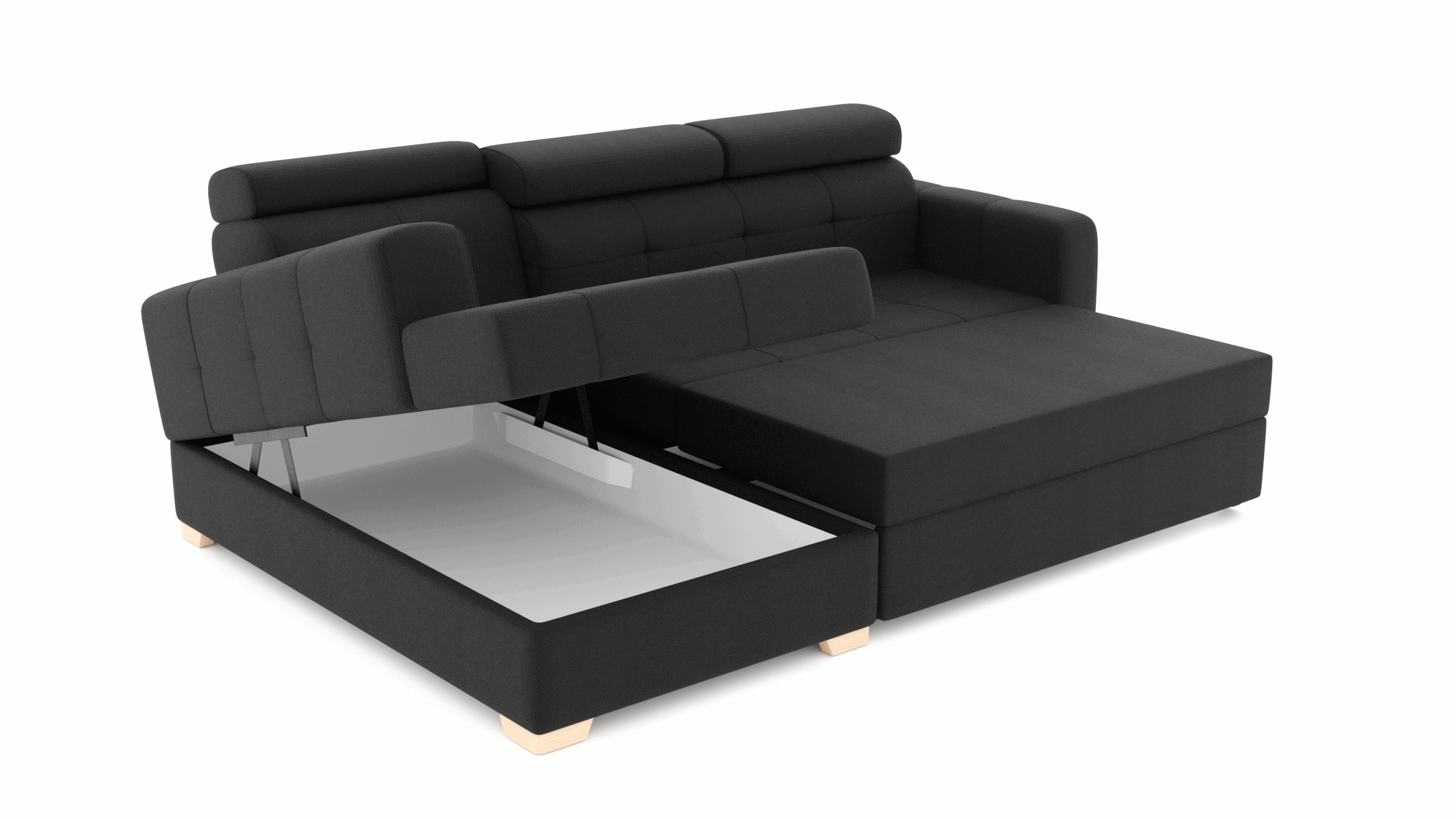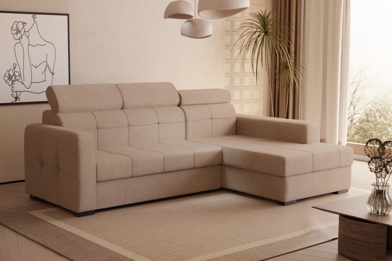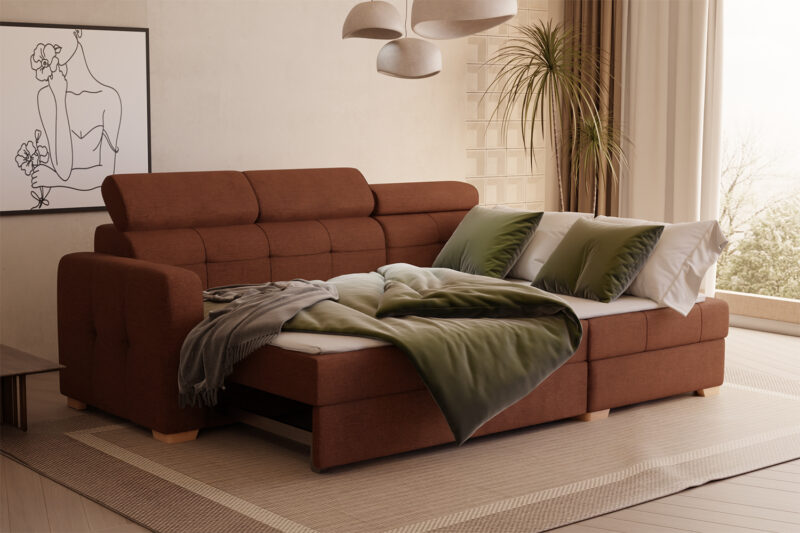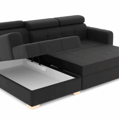 narożnik z funkcją spania, pojemnikiem na pościel oraz regulowanymi zagłówkami