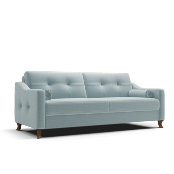 Model RIMINI został dodatkowo wyposażony w wałki, które mogą służyć wsparciu naszego kręgosłupa. Ten ciekawy wzór mebla wsparty na drewnianych stylizowanych nogach wzbogaci wnętrze i zaspokoi najbardziej wysublimowane gusta.