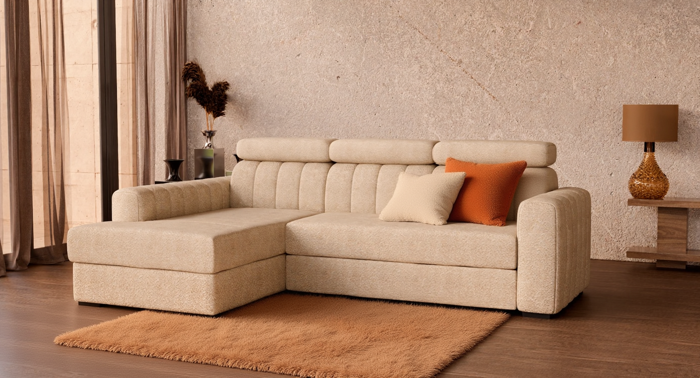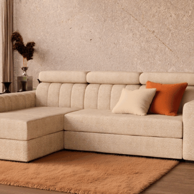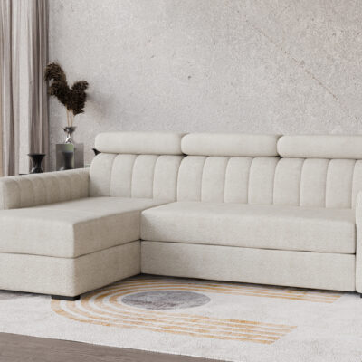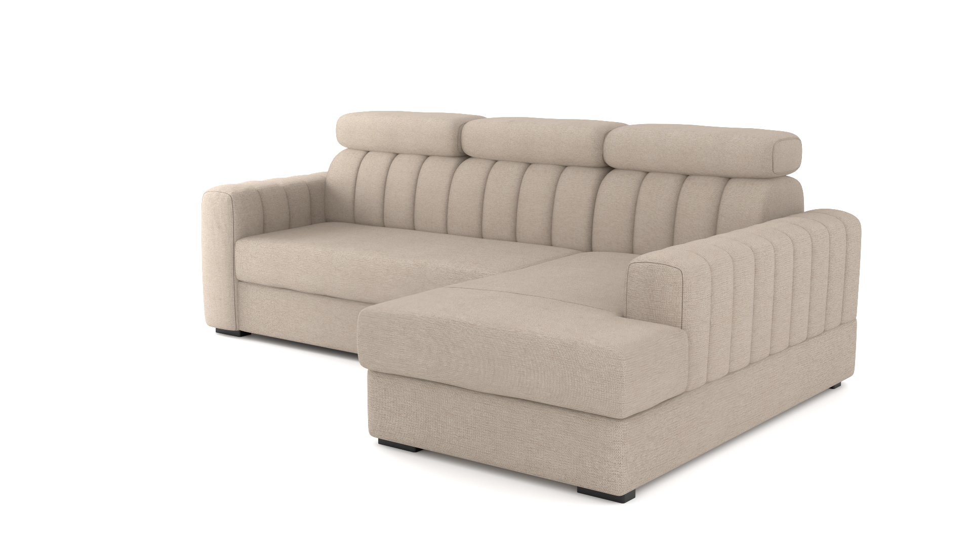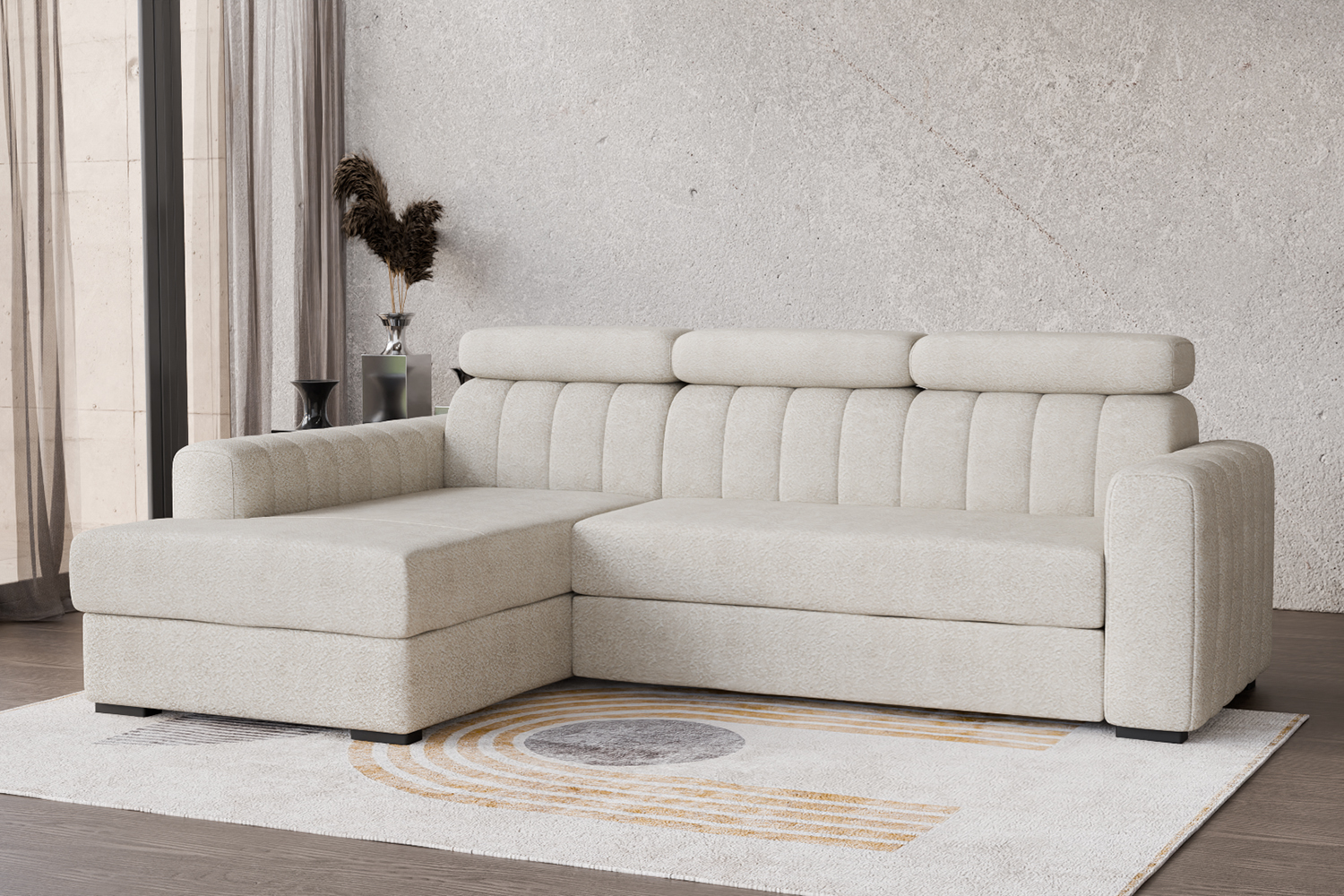 Narożnik Sono to połączenie nowoczesnego designu i praktycznych rozwiązań, które sprawiają, że salon staje się miejscem pełnym komfortu. Dzięki funkcji spania w prosty sposób zamienisz go w wygodne łóżko dla dwóch osób – idealne podczas wizyty gości lub rodzinnych spotkań. Obszerna skrzynia na pościel pomoże zadbać o porządek w Twoim domu. Regulowane zagłówki umożliwiają indywidualne dopasowanie podparcia głowy i karku, co gwarantuje wyjątkowy relaks podczas codziennego odpoczynku. Narożnik Sono dostępny jest w szerokiej gamie tkanin z oferty, co pozwala dopasować go do każdego wnętrza – od nowoczesnych, po bardziej klasyczne aranżacje.